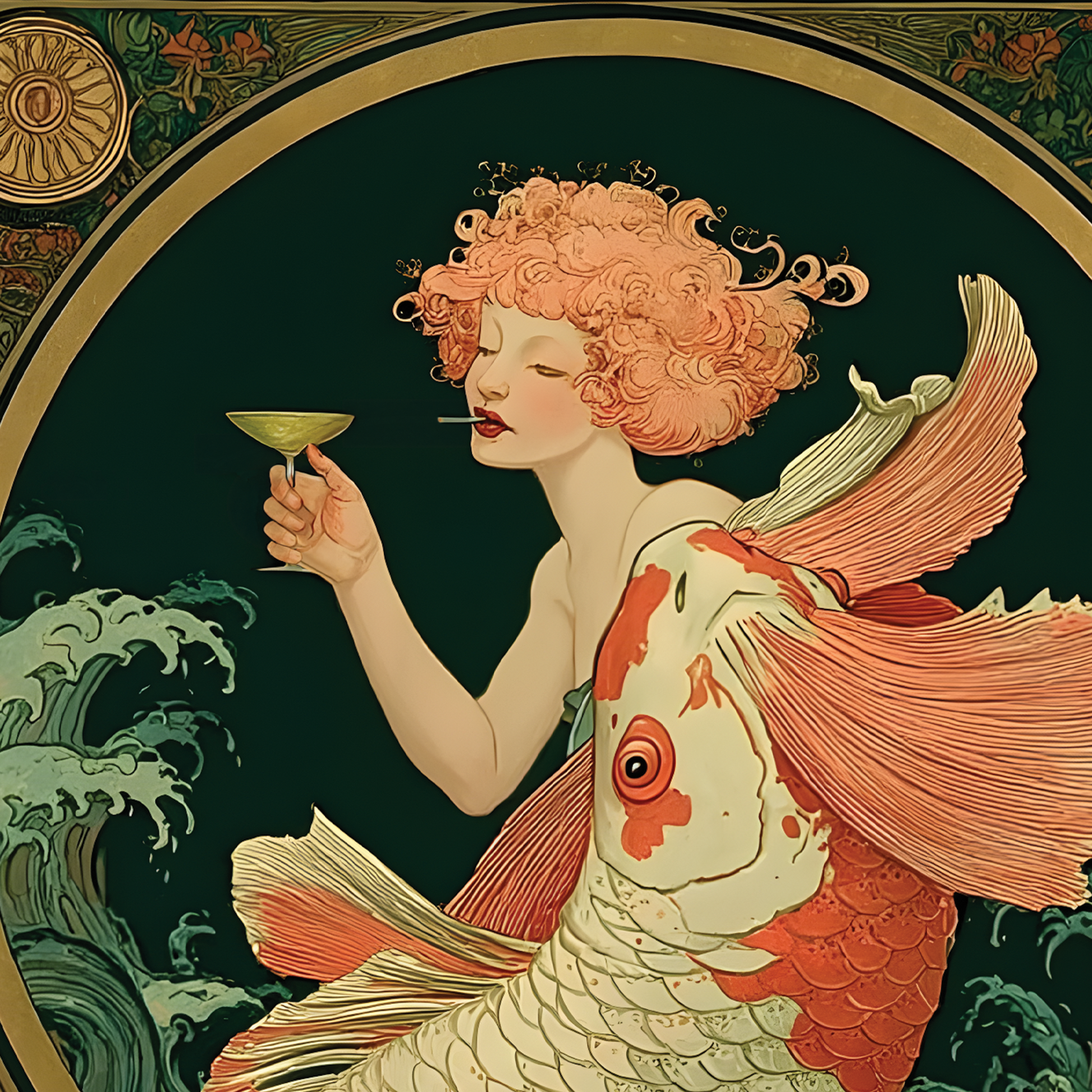 This hypnotic art print from the Spirits Collection evokes the crystalline chill of high society’s most iconic elixir, with a surreal twist: a solitary goldfish, suspended in the still waters of vermouth and velvet danger. A toast to the glamorous absurd, to the cocktail hour that never ends, and to the dreams you sip but never swallow.