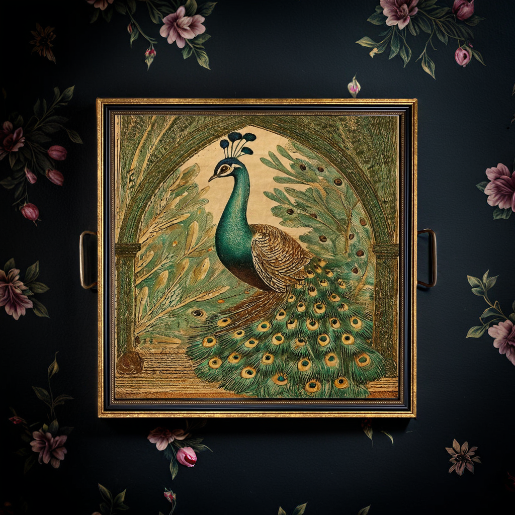 Introduce timeless sophistication into your home with our Peacock Elegance Decorative Tray, showcasing a stunning Art Nouveau-style peacock design inspired by the beauty and grace of vintage art. The intricate print, rich in detail and color, is protected by glass, framed in a luxurious gold and black resin finish, and complemented by antiqued brass handles that exude vintage charm. Whether used for serving, organizing, or as a statement decorative piece, this tray transforms any space into a work of art.