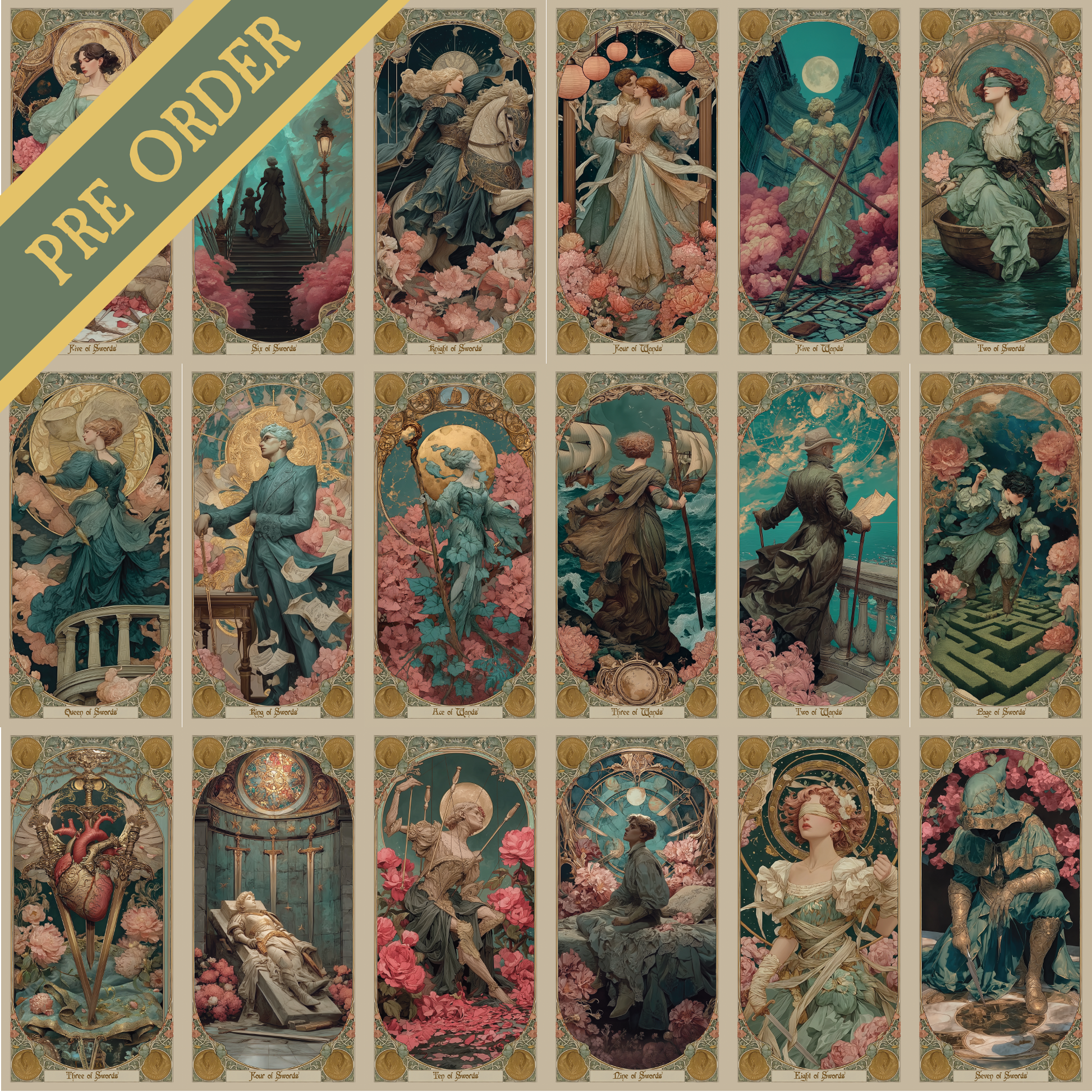 Each card is adorned with flowing lines, delicate florals, and ornate details reminiscent of Belle Époque illustrations, creating a tarot experience that feels both luxurious and timeless.